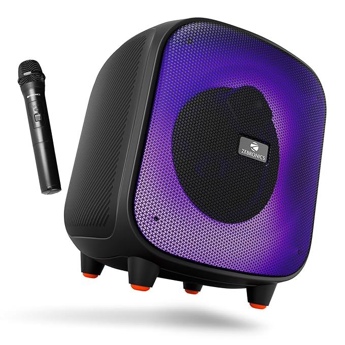 Features:RGB LED modes, TWS pairing, deep bass, karaoke function, mobile holder, splash-proof design, media and volume controls, built-in rechargeable battery